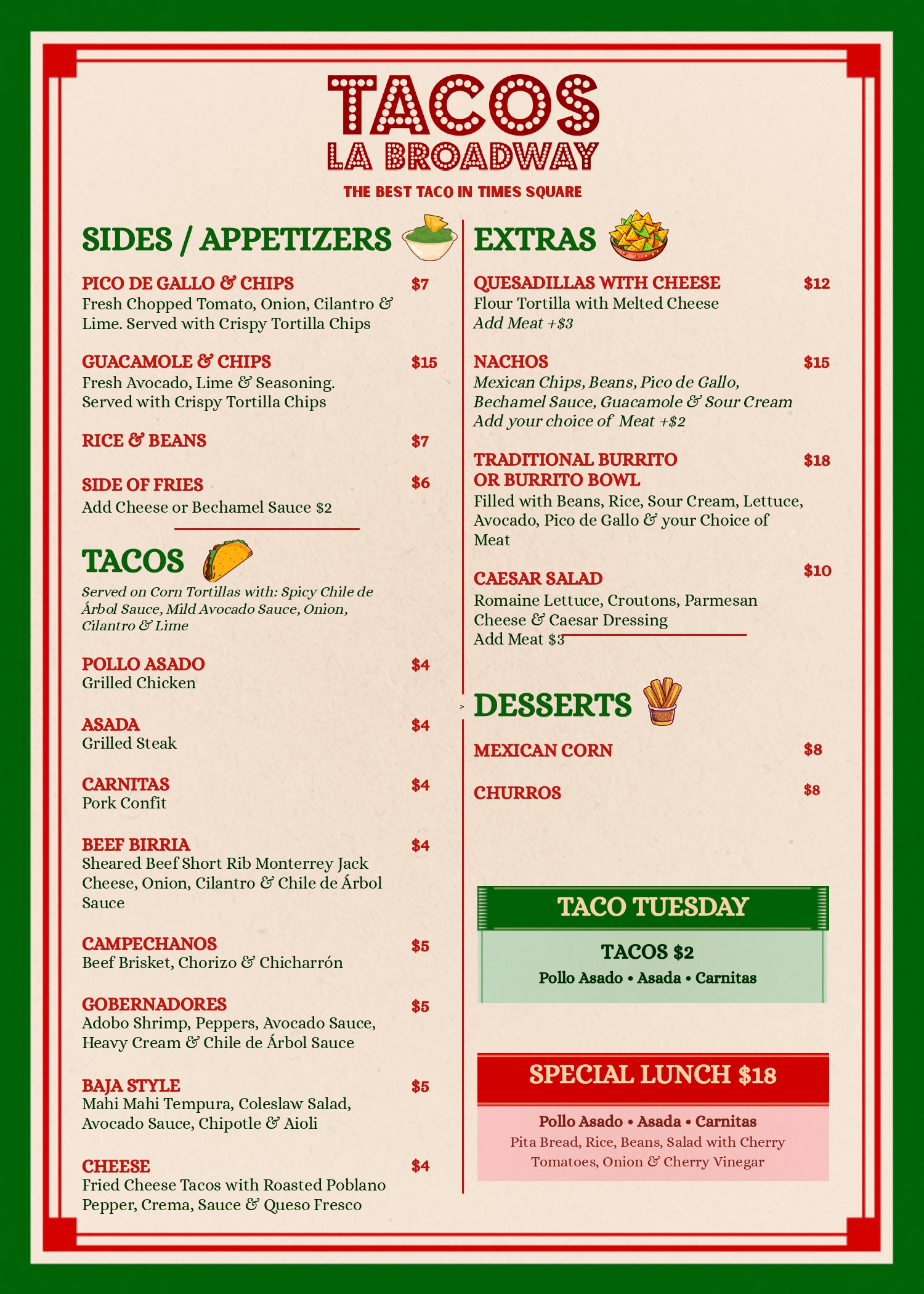Enjoy our Asada, Carnitas and Pollo Tacos for only $2 all day in Times Square every Tuesday at Tacos La Broadway